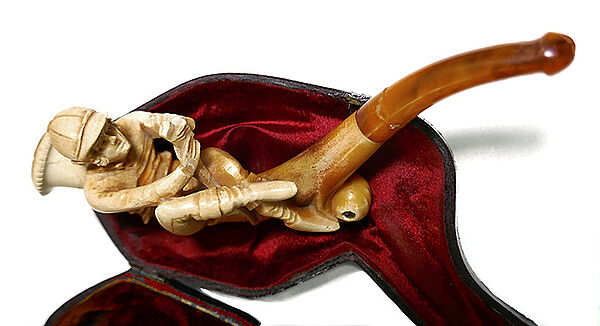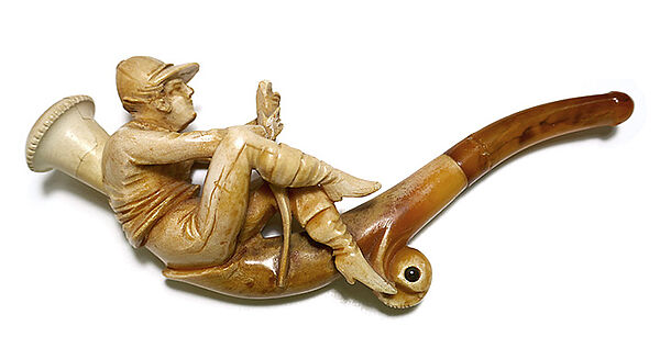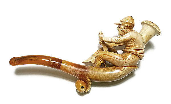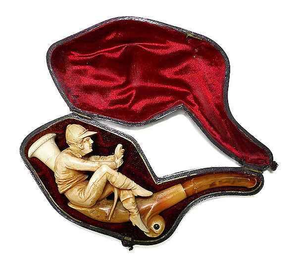 Der fein handgeschnitzte Korpus aus Meerschaum (Sepiolith) stellt einen sitzenden Jockey dar, der wohl ein Stück des Zaumzeugs (?) in den Händen hält. Das geschwungene Mundstück wurde aus semiluziden, braun-orangen Bernstein geschnitzt. Insbesondere hier und am Pfeifenkopf finden sich Klebestellen, ansonsten moderate Altersspuren. Länge ca. 11 cm. Das originale, mit leuchtend roter Seide gefütterte, außen mit braunrotem Papier bezogene, der Form der Pfeife angepasste Etui ist zweifach scharniert und mit einem kleinen Federverschlus verschließbar. Maße ca. 14 x 6,5 cm. Wohl um 1870 bis 1890.