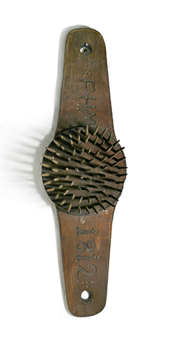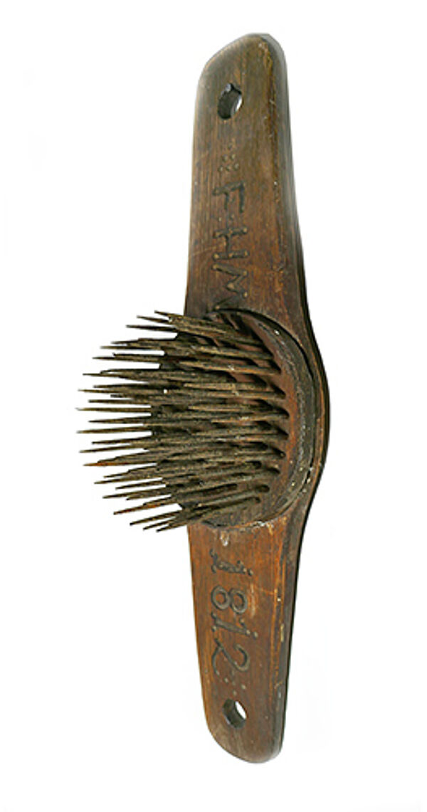 Länglicher, brettartiger Holzkorpus, der sich mittig scheibenförmig erweitert, hier sind lange Eisenborsten fixiert. Vorderseitig auf einer Seite der Borsten Besitzermonogramm "FHM", auf der anderen Seite datiert "1812", an den Enden jeweils Lochung. Länge knapp 50 cm, altersentsprechende Gebrauchs- und Rostspuren sowie Patina des Holzes.