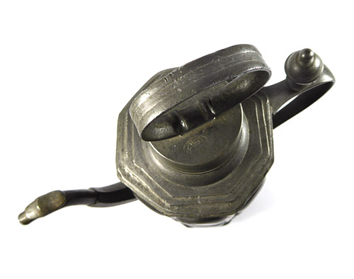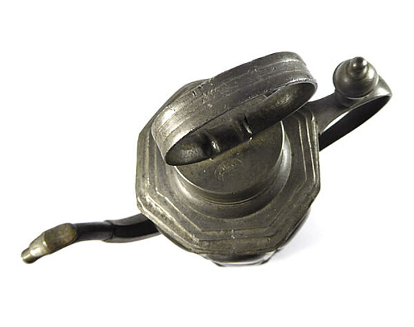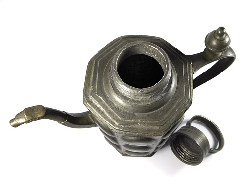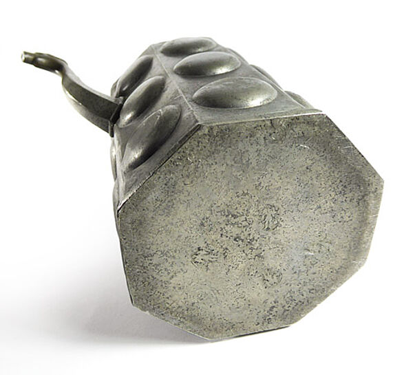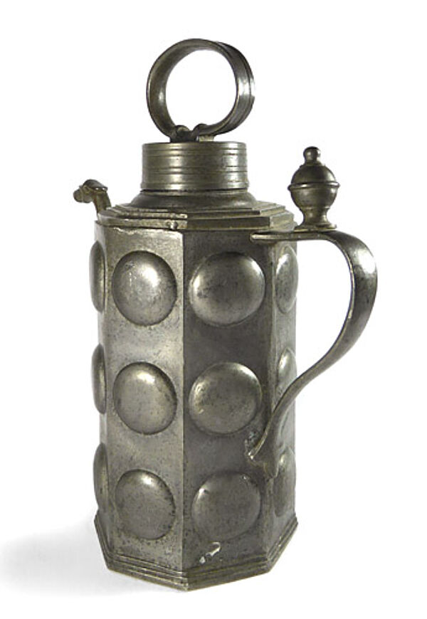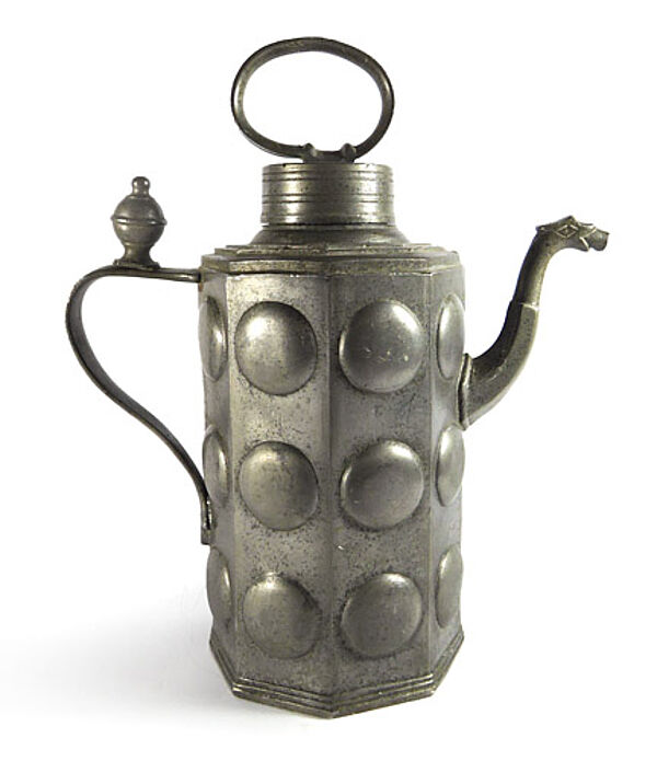 Oktakonale Schraubflasche, durch Tülle (deren Ausguss die Form eines Adlerkopfes hat) und bandförmigen Henkel (mit Kugel-Daumenrast) wird der Eindruck einer Kanne vermittelt. Schraubdeckel mit feststehendem Tragering. Die Wandung weist eine strenge Reihung von flach-konvexen Rundbuckeln auf. Höhe ca. 22 cm, geringe Altersspuren. Engelsmarke auf Schraubdeckel und Standfläche. Wohl um 1800.