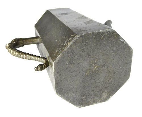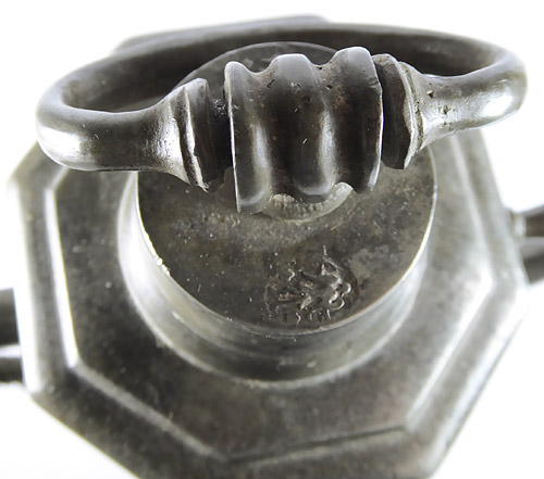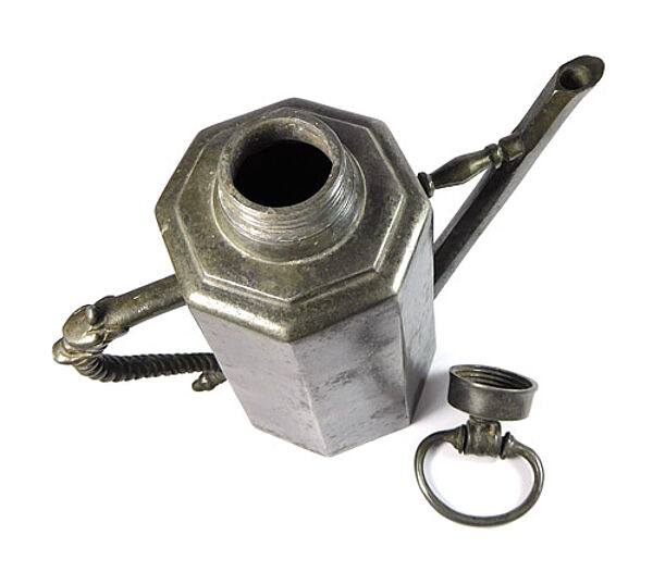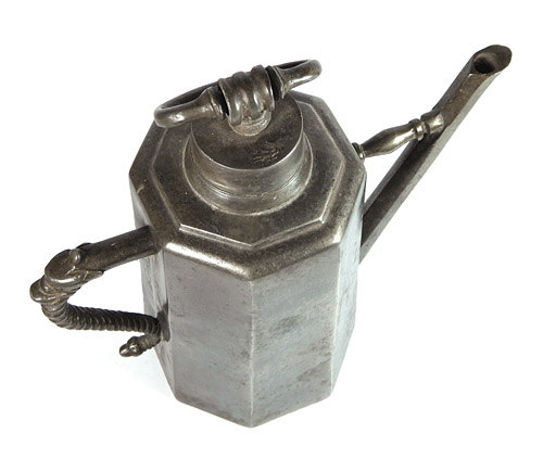 Oktakonaler, sich leicht nach oben verjüngender Flaschenkorpus aus Zinn. Durch den geriffelten Henkel (mit Drachenkopf) und die mit einem Steg versehen schlanke Tülle wird der Eindruck einer Kanne vermittelt. Schraubdeckel mit scharniertem Griff. Höhe ca. 23 cm, Henkel am oberen Ende Steg locker, leichte altersbedingte Gebrauchsspuren. Zinndeckel und Standfläche mit Engelsmarke. Wohl um 1780.