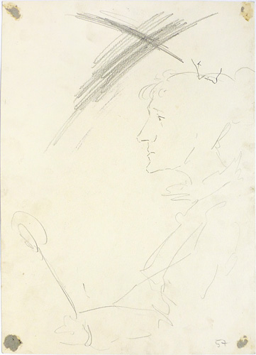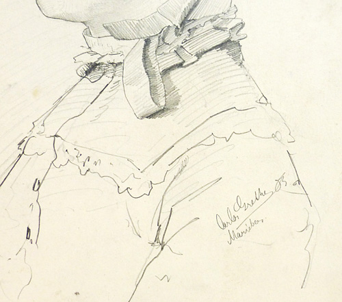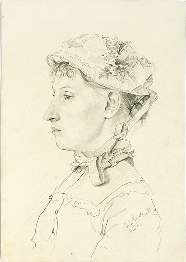 Graphit auf dünnem, chamoisetonigem Karton, rechts unten signiert, undeutlich bezeichnet "Mariechen", datiert (18)"83". Dargestellt ist eine junge Frau im Profil nach links. Blattmaße ca. 33,5 x 23,7 cm, geringe Alters-, Griff- und Schmutzspuren.