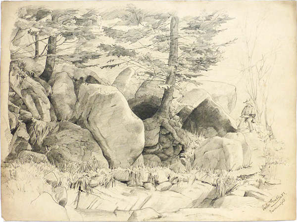 Graphit auf dünnem, chamoisetonigem Karton. Rechts unten signiert, bezeichnet und datiert (18)"83". Im Hintergrund rechts ist ein Maler beim Skizzieren, vermutlich der Künstler selbst, dargestellt. Blattmaße ca. 46,8 x 34,9 cm, geringe Alters-, Griff- und Schmutzspuren.