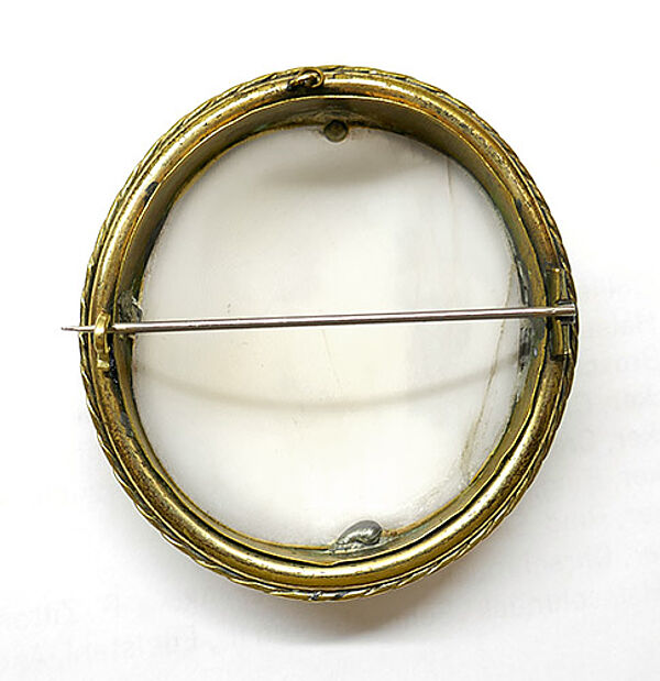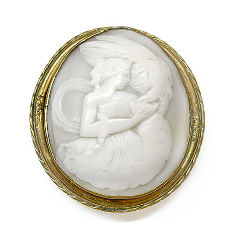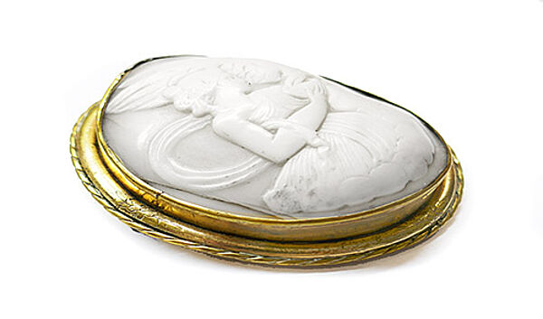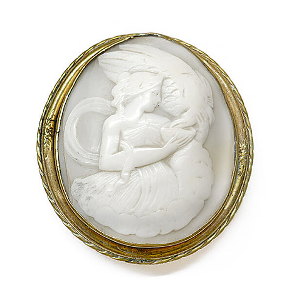 Hochovaler, leicht gewölbter Korpus einer handgeschnitzten Muschelkamee mit vergoldetem (Messing?)Rand. Dargestellt ist im erhabenen Relief die Göttin Hebe (= Göttin der Jugend), die einen Adler füttert (sie gilt auch als der Mundschenk der Götter). Rückseitig einfache Broschierung, zudem oberseitig bewegliche Anhängeröse. Maße ca. 6,5 x 5,8 cm, moderate Altersspuren. Wohl um 1840 bis 60.