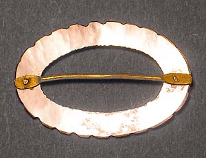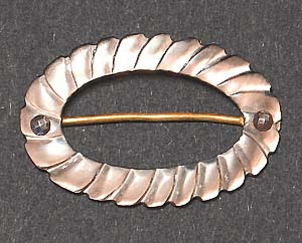 Der ovale Korpus besteht aus einem geschnitzten Perlmutt-Band mit geschuppter Oberfläche, an das ein Messingsteg genietet ist, die Nietenköpfe zeigen ein feines Hammerschlagdekor. Breite ca. 4 cm, für Gürtelbreite ca. 2,8 cm. Unbezeichnet, evtl. Deutschland um 1880.