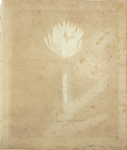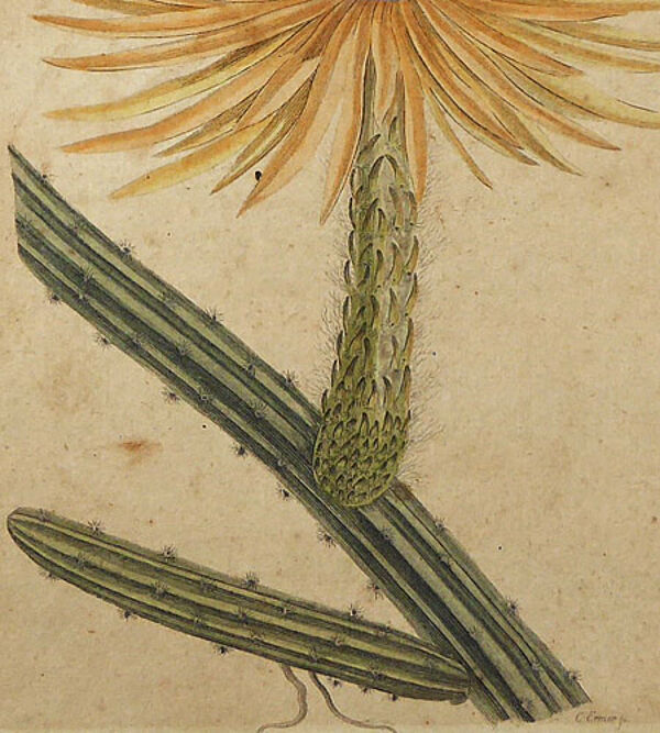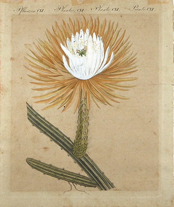 Aquarellierter Kupferstich auf Bütten, rechts unten in der Platte signiert, oberhalb der Darstellung bezeichnet: "Pflanzen CXI....., rückseitig handschriftlich später bezeichnet: "Cactus Grandiflora" sowie "1797 Carl Ermer, Weimar". Blattmaße ca. 23,7 x 19,8 cm, Druckstockmaße ca. 22 x 18 cm. Am oberen Rand Klebereste, am rechten Randbereich kleine Quetschfalte, ca. 1797.