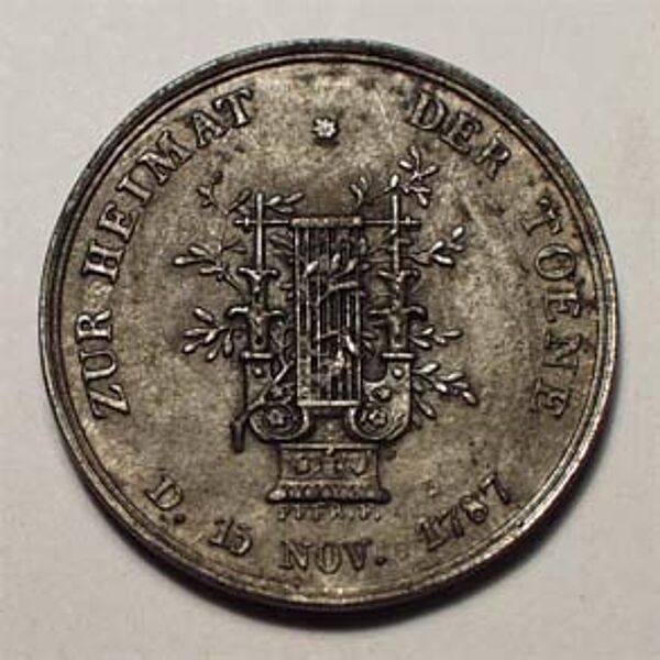 Portraitmedaille mit einem Durchmesser von ca. 3cm. VS: Gluck im Profil sowie Bezeichnung "Christoph Gluck, geb. 14. Febr. 1713" signiert "Voigt". Unebenheit im Spiegel in Höhe Stirnbereich (s.Foto), für eine Eisengußmedaille aber insgesamt guter Zustand. RS: Lyra od. ähnliches Instrument und Pflanzen, umseitig beschriftet "ZUR HEIMAT DER TOENE D. 15. Nov. 1767"