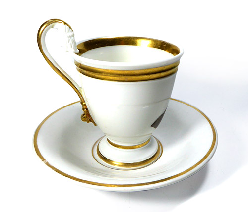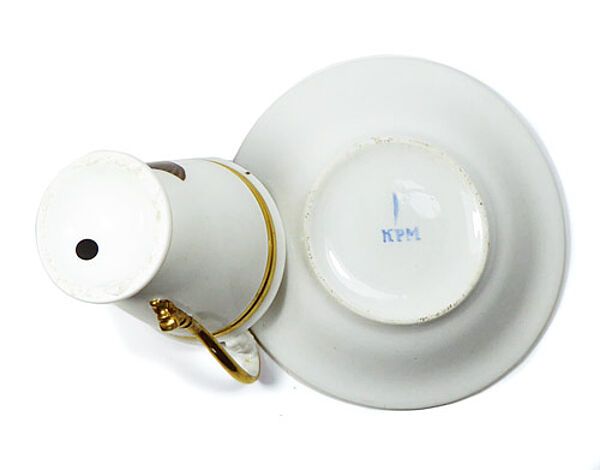 Typischer klassizistischer Porzellankorpus. Die gefusste Tasse hat einen Schwanenhalshenkel mit antikem Gesichtsrelief am Ansatz. Vorderseitig handgemaltes Portrait von Dr. Martin Luther in Brauntönen. Tasse und Untertasse jeweils mit Goldrand. Untertasse mit handgemaltem KPM-Signet (nachempfunden?). Höhe der Tasse ca. 8,5 cm, mit Henkel ca. 10,4 cm, Höhe mit Untertasse ca. 11,2 cm (bis zum Henkel), Durchmesser der Untertasse ca. 14,2 cm. Geringe Altersspuren, im Tasseninneren zwei kleine dunkle Brandflecke. Wohl Deutschland um 1820 bis 60.