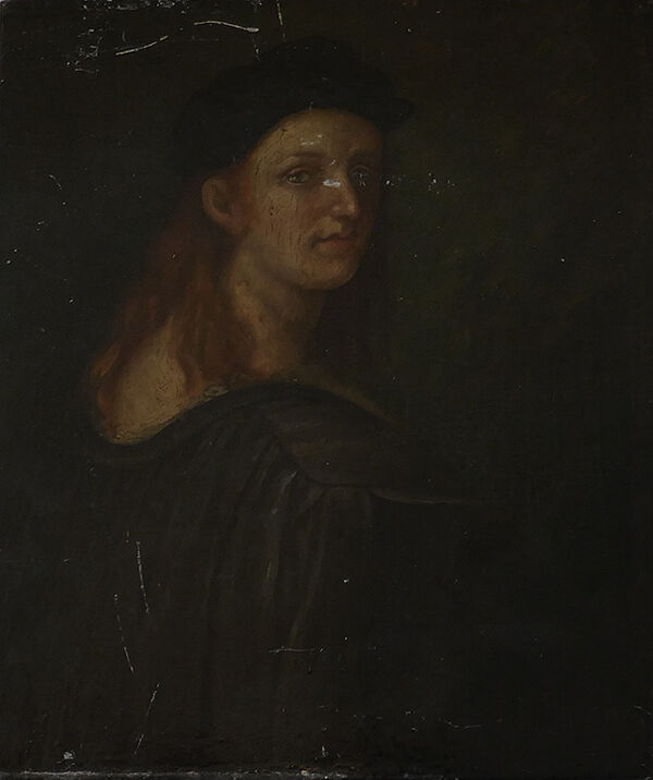 Öl auf Holzplatte, dargestellt ist das Halbportrait eines jungen Mannes. Hierbei handelt es sich um die Kopie des Gemäldes von Raffael (Sanzia da Urbino, 1483 - 1520) des bedeutenden Bankiers Bindo Altoviti, welches um 1514/15 entstand, lange als Selbstportrait des Künstlers angesehen wurde und in der Albertina in Wien hängt. Maße ca. 19,5 x 16 cm, rückseitig Reste einer Parkettierung. Ungereinigter Zustand mit kleinen Farbverlusten, siehe Foto. Entstanden wohl Mitte / Ende des 19. Jahrhunderts.