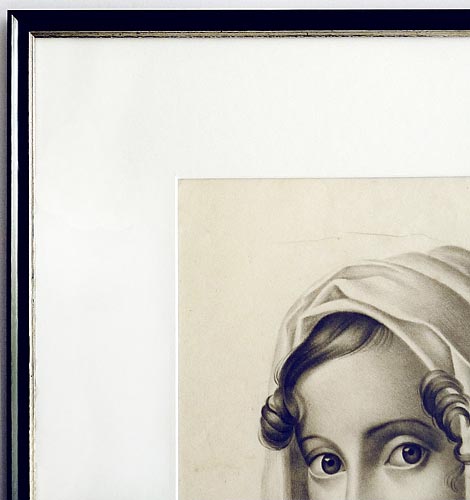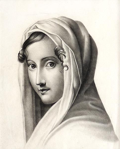 Filigrane Kohlezeichnung auf chamoisefarbenem Papier einer über die Schulter zurückblickenden jungen Frau (attrib. Vittoria Caldoni), deren Kopf mit einem Tuch bedeckt ist. Unter Passepartout. Sichtmaß ca. 32,7 x 27,9 cm. Leicht gebräunt, moderate Griff- Alters- und Lagerspuren. Unsigniert, neuzeitliche schwarz-silberne, gekehlte Leiste mit Antikoptik. Außenmaße ca. 52 x 46 cm. Wohl um 1830 / 35.