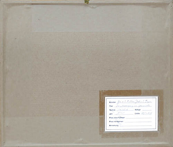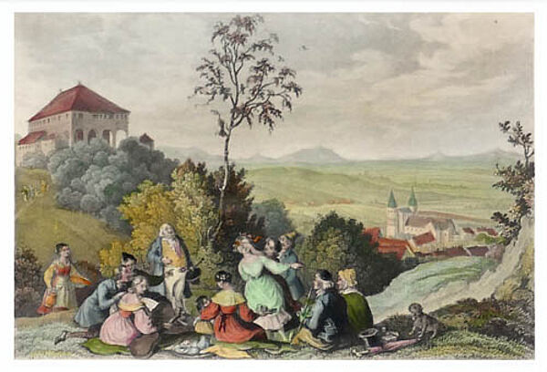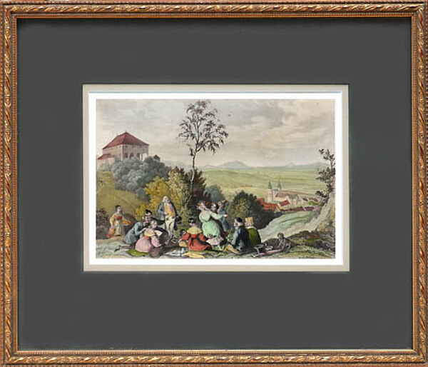 Polychrom handkolorierter Stahlstich auf kräftigem Papier. Unter der Darstellung links bezeichnet "Gez. v. L. Richter" und rechts "Gest. v. L. Beyer", rückseitig Etikett mit Betitelung "Der Stubenberg bei Gernrode" und Datierung "1840". Hinter neuzeitlichem dunklen Passepartout, gerahmt mit schmaler, Gold-gefasster, älterer Holzleiste mit kordelartigem, reliefierten Ornament, ungeöffnet. Diese hat die Außenmaße von ca. 28 x 24 cm, Bildmaße ca. 15,5 x 10,5 cm, geringe Altersspuren.