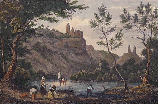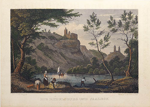 Kolorierter Stahlstich: "Die Rudelsburg und Saaleck" um 1850