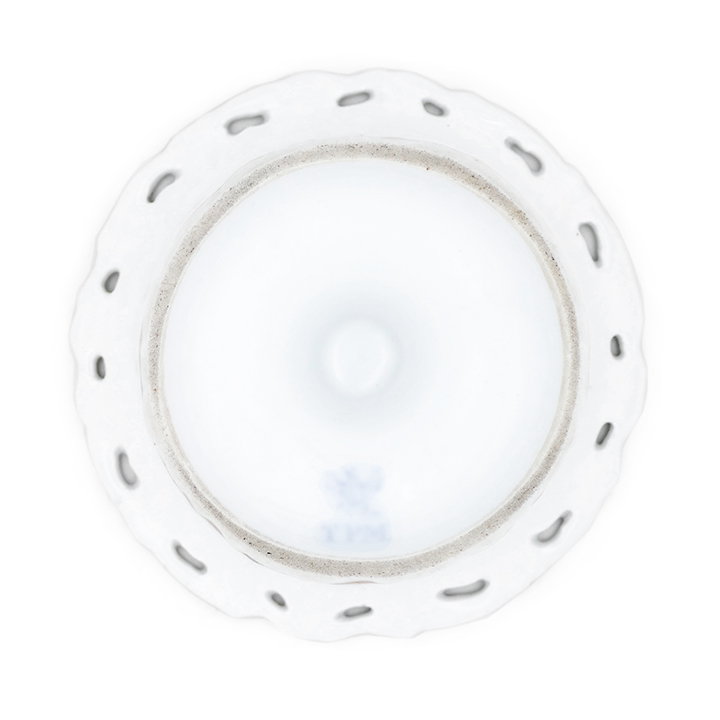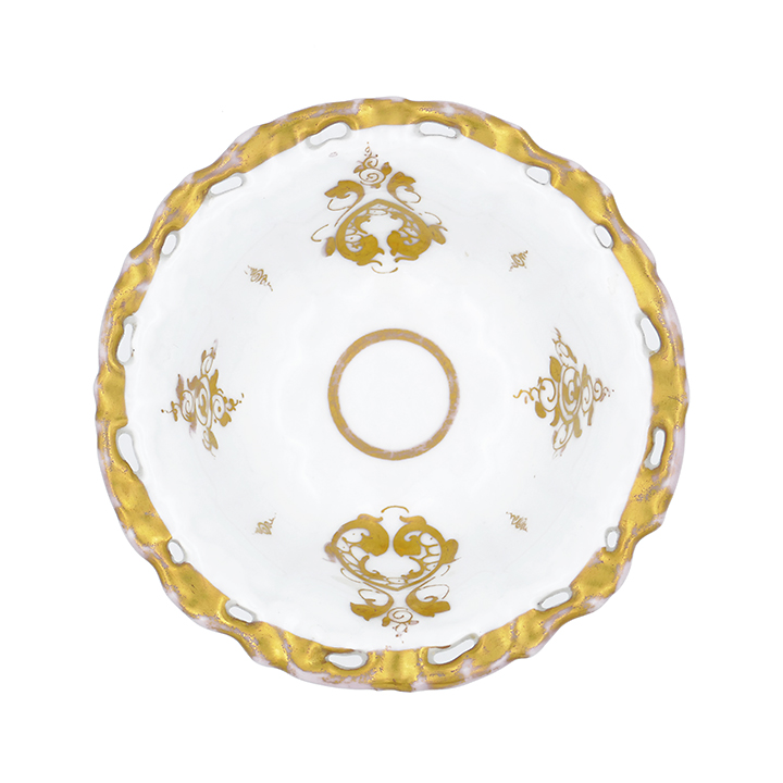 Gefußter Porzellankorpus mit glockenförmig gewölbter Schalenform. Der leicht ausgestellte, flach reliefierte und durchbrochen gearbeitete Randbereich ist vergoldet. Ebenso der reliefierte Rand entlang des Standes und ein schmaler Reif in der Taille des Gefäßes. Im Schaleninneren stilisiert florales Golddekor. Höhe ca. 7,5 cm, geringe Altersspuren, so ist die Vergoldung des Randes minimal berieben, siehe Foto. Unterseitig Markung, die vor 1900 verwendet wurde, vermutlich stammt die Schale aus der Zeit um 1850 bis 1880.