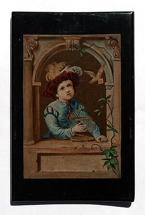 Lackmalerei auf Holzplatte: ohne Titel (Kind am Fenster mit Brieftaube)