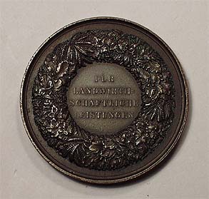 Bronze-Medaille (=Staatspreis für Landwirthschaftliche Leistungen, verliehen ab 1878) mit einem Durchmesser von ca. 41 mm, Vorderseitig: Ceres im Kreis von Allegorien, dabei u.a. Pferdezucht, Imkerei, Fischzucht, Weinbau, sign. Loos D. (=Direktor), rückseitig (Lorbeer?-)Kranz mit Beschriftung: "Für Landwirtschaftliche Leistungen". Schöne Patina, siehe Detal-Foto.