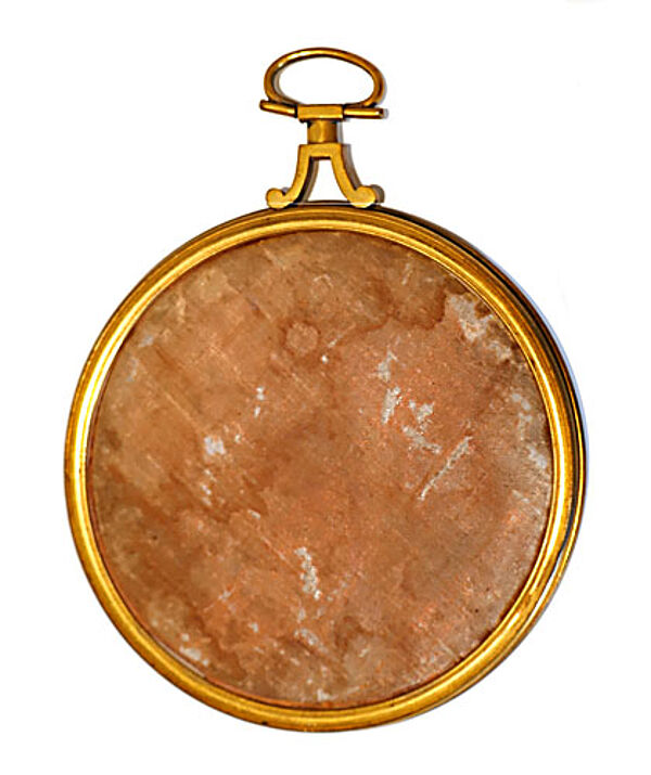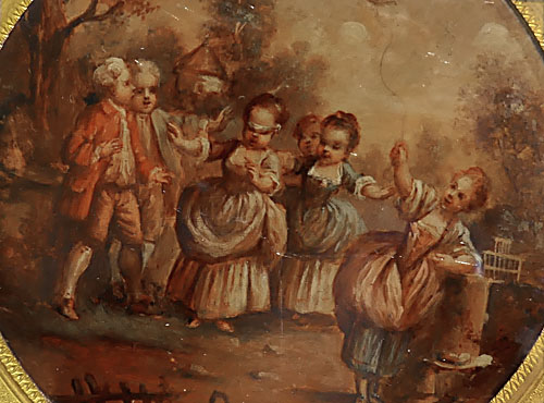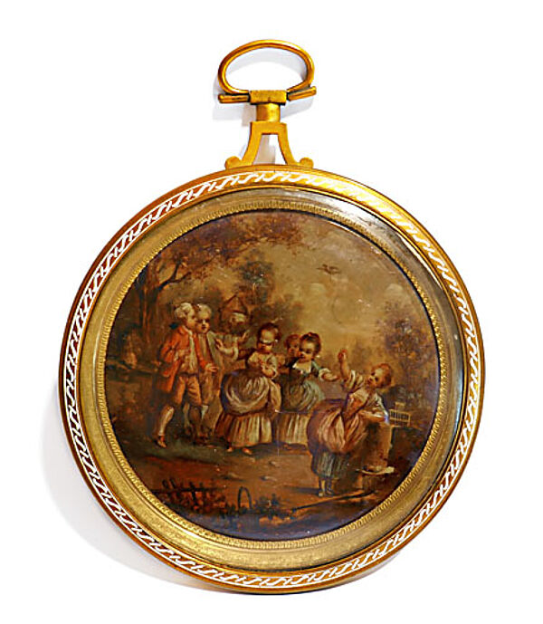 Lupenmalerei auf Seide (??). Dargestellt ist eine Rokoko-Gesellschaft im Stile von Antoine Watteau, wobei die Protagonisten Kinder sind. Zarter, runder Messingrahmen mit weißen Emaille-Einlagen, leicht gewölbtes Glas, oberseitig dominante, bewegliche Öse. Durchmesser der Malerei ca. 7,7 cm, Außendurchmesser des Rahmens ca. 9,6 cm, maximale Abmessung unter Einbeziehung der Öse ca. 12,5 cm, insgesamt geringe Altersspuren, die rückseitige Seide wirkt etwas fleckig und verschlissen (die kleinen weißen Flecke auf dem Detailfoto sind Lichtreflektionen). Evtl. Skandinavien um 1840 bis 60.