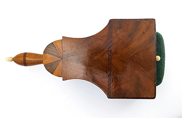Würfelförmiger, furnierter, teilweise intarsierter Holzkorpus, der auf einer Seite nach unten eine schildartige Blende aufweist, welche eine unterseitige Schraubzwinge gleichermaßen trägt und verdeckt, oberseitig viereckiges, grünes Nadelkissen, welches von 4 Elfenbeinperlen flankiert wird. Eine von diesen ist der "Öffner" für einen kleinen, versteckten Schub im Korpus. Maße ca. 25 x 11 x 7,5 cm, geringe bis allenfalls moderate Altersspuren. Wohl um 1830 bis 1850.