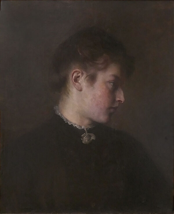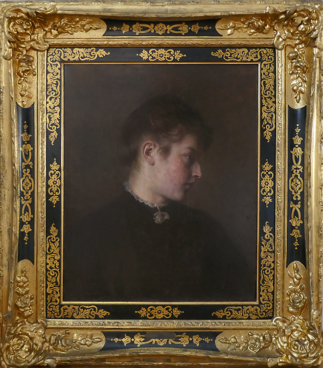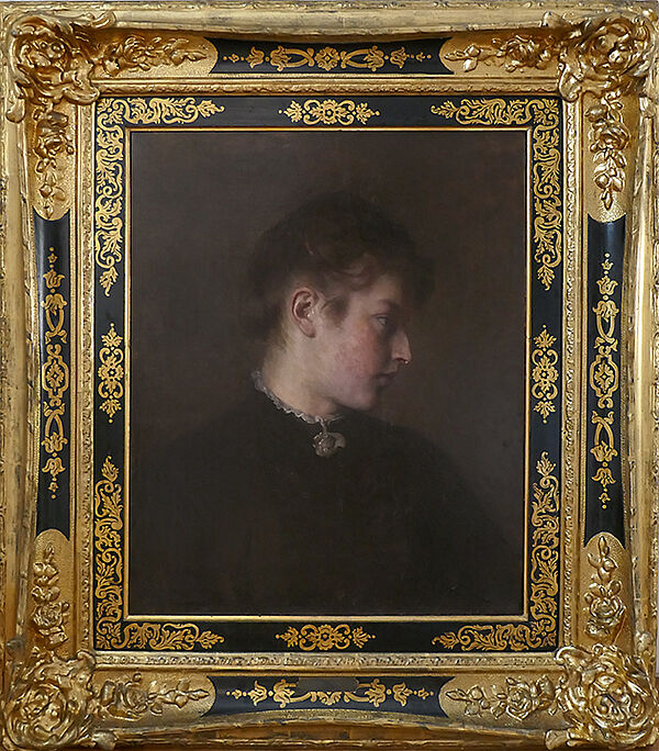 Öl auf Leinwand, rechts unten signiert "G. Hackl". Sehr sensibles, gleichsam intensives Brustportrait einer jungen Frau im Profil nach rechts. Dem Portrait sieht man u.E. den Einfluss von Wilhelm Leibl an, der ebenfalls wie von Hackl Mitglied in der 1896 gegründeten Luitpold-Künstlergruppe war, einer Abspaltung der Münchner Künstlergenossenschaft. Prunkvoller, teilweise schwarz abgesetzter, überwiegend aber vergoldeter, Stuckrahmen "aus der Zeit", der die Außenmaße von ca. 85 x 74 cm aufweist. Bildmaße ca. 56 x 46 cm. Es zeigen sich moderate Altersspuren, so am Unterrand des Gemäldes, welches professionell gereinigt wurde, zudem erfolgten kleinere Retuschen. Die Vergoldung des Rahmens wurde teilweise ausgebessert. Wohl um 1890 bis 1900 (bei Artprice finden sich zwei Gemälde des Künstlers, welche ebenfalls Halbportraits junger Frauen, einmal im Profil nach rechts, einmal im Profil nach links zeigen, Ersteres ist 1898, Letzteres 1891 datiert.