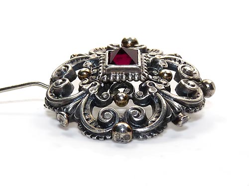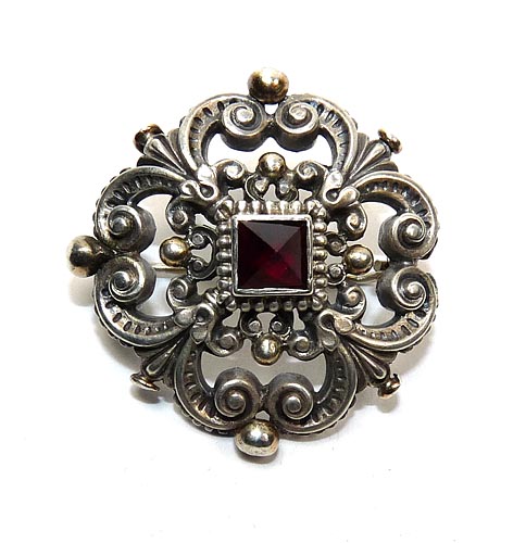 Silberne Historismus-Brosche mit rotem Stein
