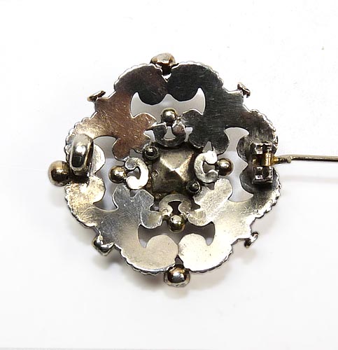 Annähernd runder, durchbrochen gearbeiteter Silberkorpus (geprüft) in (Neo-)Renaissance-Ornamentik. Mittig ist ein facettiert geschliffener, roter Stein (vermutlich Granat) in Zargenfassung integriert. Maße ca. 3,3 x 3,5 cm, ungeputzter Zustand mit leichter Patina und geringen Tragespuren. Rückseitig einfache Broschierung. Ungemarkt, wohl Deutschland um 1880/90.
