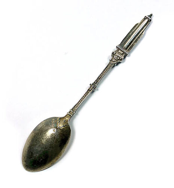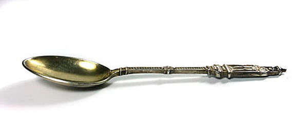 Silberner Korpus (800er), dessen Stielende eine halbplastisch ausgearbeitete, stilisierte Darstellung des Bremer Rolands zeigt. Der übrige Stiel weist ein angedeutet architektonisches, der Renaissance bzw. Weserrenaissance verpflichtetes Dekor auf. Länge ca. 11,5 cm, geringe Gebrauchsspuren, in der Laffe sind Reste einer Vergoldung auszumachen. An der Außenseite der Laffe Markung, wohl um 1890.