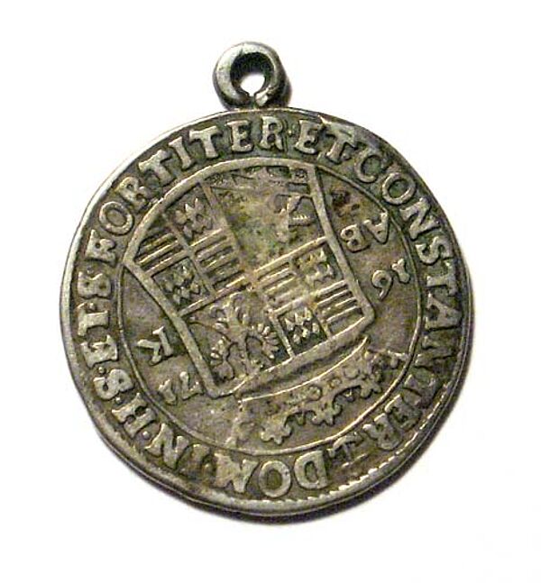 Silberner Münzanhänger: 1/3 Taler von 1671, St. Georg im Kampf mit dem Drachen
