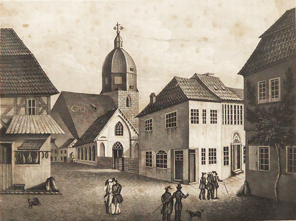 Stahlstich: Die Luther-Schule und das Luther-Haus in Eisleben um 1840